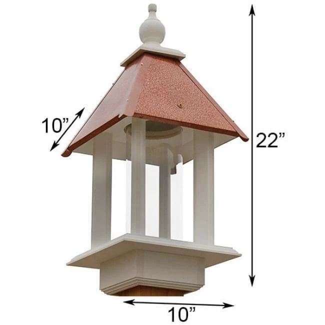 The feeder is crafted from solid PVC trimboard, which will not mold, mildew, or delaminate for years of use. The copper colored galvanized metal covering over the plywood roof perfectly contrasts the white base, columns, and finial. The copper color and hammered finish of the roof adds even more texture to the piece. The finial removes easily from the roof for quick cleaning and refilling of the feeder. Mount this feeder on a square 4″ x 4″ post (not included) for easy visibility. Bring birding excitement into your yard with the Pavilion Bird Feeder with Hammered Copper Roof. Handmade in the USA.Â