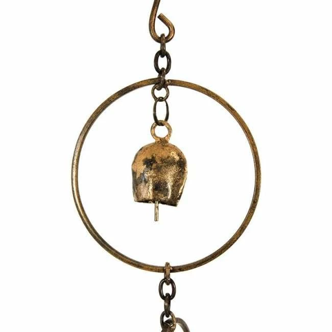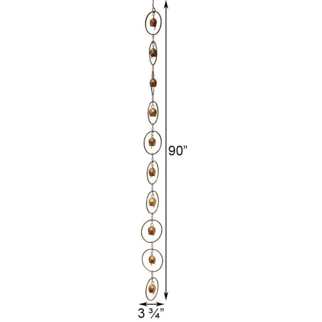 Bring your love of music into your garden in a unique new way using the Ancient Graffiti Bell Rain Chain. Using a rain chain, rather than a downspout, to direct water from your gutter brings a wonderful bit of style to your home, and the small bells throughout this unit further enhance it with sound. Each of the 3.75″ diameter hoops houses a 1.25″ long bell, which chimes gently both in the wind and when rain cascades down it. The steel rings softly direct water from your gutter to the ground, and the copper colored finish enhances your landscaping. Situate a decorative basin or barrel beneath the chain to collect water for use later, or to prevent heavy rain from washing out your yard. Its 90″ length is fantastic for many sized homes, and an included steel clip slips securely into your downspout for easy installation. Add a dramatic look to a corner of your home with this Bell Rain Chain.