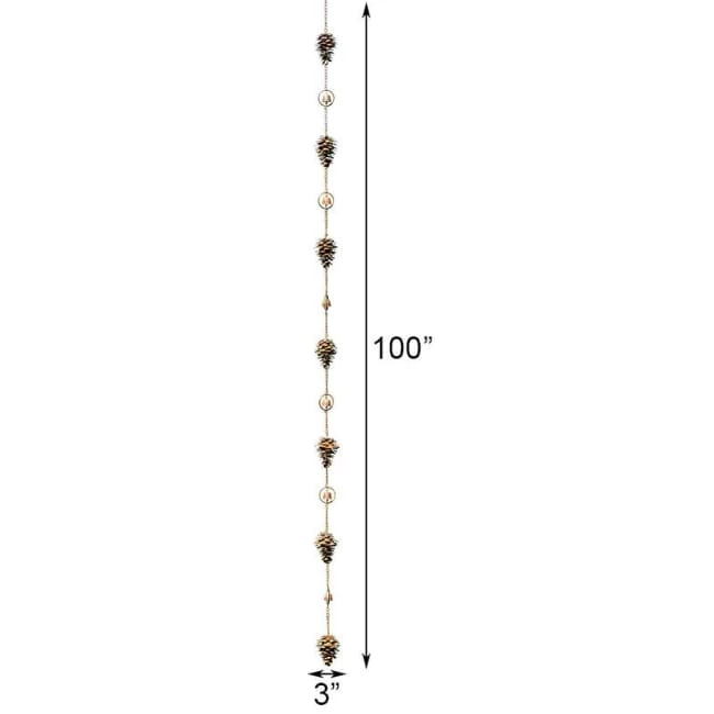 Bring evergreen style to a corner of your home with this Ancient Graffiti Pine Cones and Bells Rain Chain. Using this striking chain in place of a downspout lends a unique look to your home, as well as adds gentle sound to the setting. Seven intricate, metal pine cone shapes create a line, while bells within rings rest between them, and a chain connecting each element completes the piece. The wealth of brown hues meshes with the outdoors, and the flamed finish adds dimension. This chain is fantastic for helping direct rainwater from your gutter to the ground, taking the place of a downspout. An included gutter clip installs into the opening on your gutter, and a hook at the top of the chain allows you to suspend it easily. Its generous, 100″ length fits on many different homes, and the chain links may also be removed for versatility. The metal body remains durable and beautiful for several seasons, while the pine cone motif celebrates nature. Stylishly direct rainwater using this Pine Cones and Bells Rain Chain.
