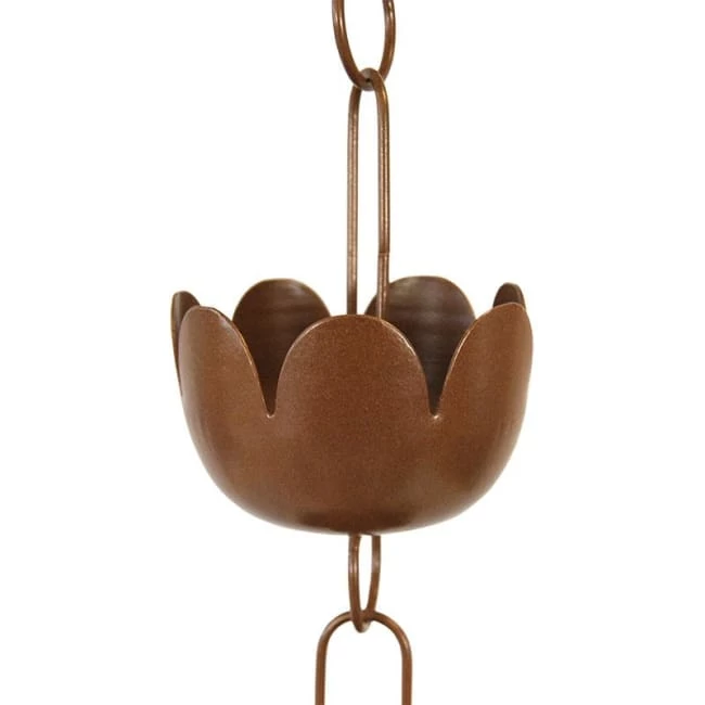 Add a decorative element to your gutter system with the Ancient Graffiti Lily Rain Chain. Placing a rain chain at the end of your gutter, rather than a downspout, lends beauty and style to your home, while the gently flowing water adds a peaceful background sound. Open lily flower figures create this robust, steel unit, and the browned copper color throughout the item adds a natural look. Scalloped edges on each cup further the floral theme, and their rounded sides and open bases allow water to gently cascade down the chain. Place a barrel or decorative basin beneath the chain to collect the water for use in the garden, or to keep heavy rains from eroding your lawn. A steel clip slips securely into your gutter outlet, making it simple to replace your downspout, and the 94″ length of this chain is great for many homes. Each flower cup and chain section may also be removed for a truly customizable size. Turn a corner of your home into a wonderful, decorative accent using this Lily Rain Chain.