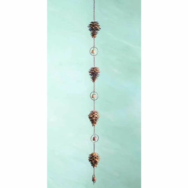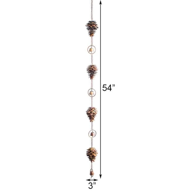Showcase evergreens in your yard or home easily using this Ancient Graffiti Flamed Copper Colored Pine Cone Decorative Hanging Chain. This fantastic line of four, metal pine cone shapes lends natural style to your setting, while a bell between each cone provides gentle sound. The tapered shape and multitude of layers on each pine cone add realism to them, and a chain between these and each bell creates a connected piece of artwork. A 2.25″ diameter, metal ring around each bell brings further shape and style to this piece, while its brown tones enhance the natural look. Use the included hook to hang this adornment from a bracket or branch, to create wonderful sound in your garden or home. The metal construction remains durable for many seasons, and the classic color scheme celebrates the outdoors. Add a hint of evergreens to your home or yard with this Flamed Copper Colored Pine Cone Decorative Hanging Chain.