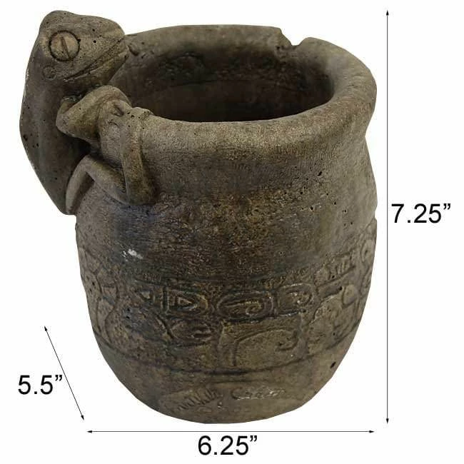 Display a flower or some herbs in a timeless and whimsical vessel using this Athens Aged Pine Mayan Frog Planter. This sturdy, concrete planter lends unique style to your flower, thanks to its Mayan inspired accents and an expressive frog figure. The 4.75″ deep unit holds plenty of soil, and its 3.75″ diameter, top opening provides a wealth of planting room. A realistic tree frog figure appears to clutch to the side of the unit, while an impressed center band sports raised Mayan figures. A hole on the base of the piece allows water to drain, preventing overwatering of the plant, and the yellow hues beneath the gray overtone enhance your herbs. The level base on the planter rests easily in your soil through the spring and summer, and looks great in your home during the cold months for protection from the elements. Lend a bit of archaeological flair to your favorite flower with this Aged Pine Mayan Frog Planter.