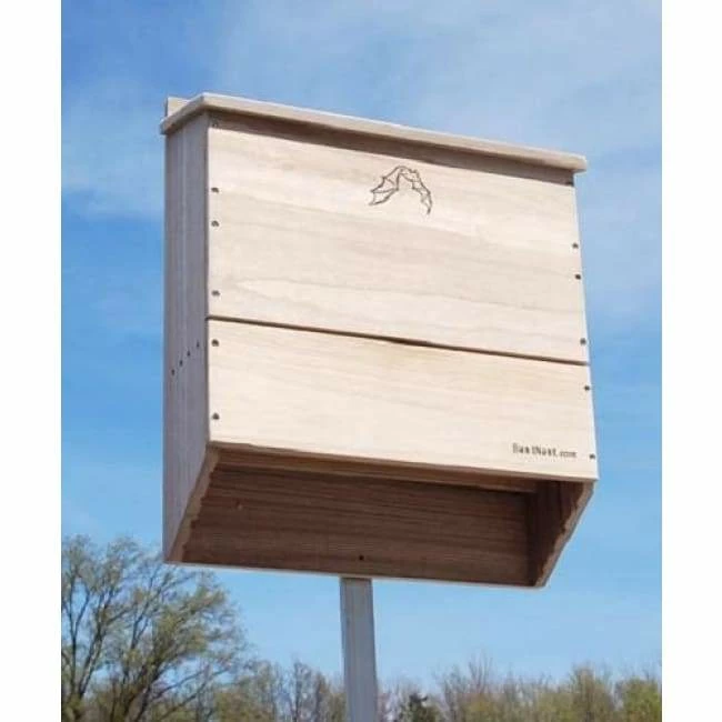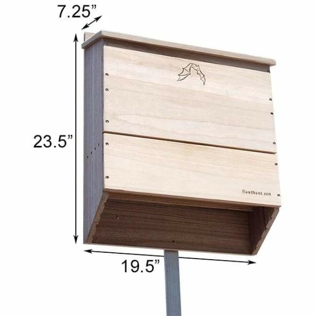 Invite a beneficial colony of bats into your backyard with the BestNest Five-Celled Bat House. Meticulously designed for efficiency, this sizable bat house will allow for a much higher occupancy percentage than smaller units. The interior chamber surfaces and landing platform are crafted from deeply grooved wood, creating an excellent clinging surface for landing and roosting bats. Each of the five chambers measures approximately 1″ deep, while a 0.25″ ventilation slat in the front helps to regulate temperature and increases air circulation. The slanted roof offers a unique tongue and groove assembly to keep the interior dry and safe from the elements. A beautifully designed emblem of a bat in flight adorns the front surface, and the furniture grade wood construction is built to last. This house may be mounted to a vertical surface with any of the three predrilled holes at the top and single stabilizing hole at the bottom. Bring these interesting and helpful creatures into your yard with the BestNest Five-Celled Bat House.