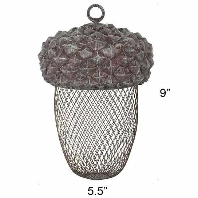 Watch the birds in your backyard go nuts feeding from this Esschert Design Acorn Mesh Bird Feeder. The realistic acorn shape of this item lends a whimsical look to your yard, while its hardy construction lasts for many seasons. A textured, resin cap with overlapping scales supports the tapered, mesh base, creating a familiar and fun acorn shape in moments. This reservoir accommodates 0.75 quarts of sunflower seeds or peanut chunks, and its diamond-shaped grid enables clinging birds to dine. Suspend this item from a bracket or other hanger using its top metal loop, which can also be unscrewed for opening and refilling the piece. The brown and black hues enhance the natural effect, and the metal and resin body offers longevity. Provide select songbirds an exciting and adorable dining spot with this Acorn Mesh Bird Feeder.