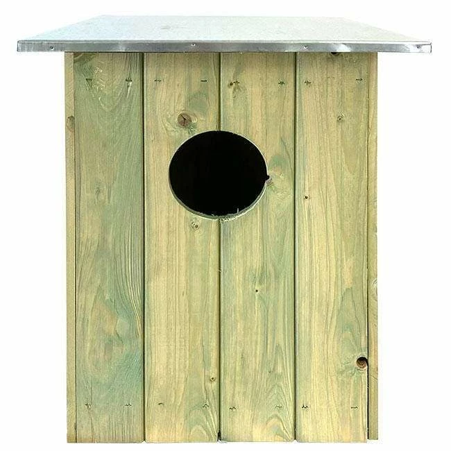 Help birds of prey find adequate shelter by placing this Esschert Design Tawny or Barred Owl House within your trees. This significant, wooden shelter provides small or medium owls a lasting nesting spot, while helping you celebrate a different bird species. The wide, pine slats create a classic, rectangular abode, while an overhanging roof protects the interior from the elements. Metal covers this roof for further style, and the 5″ diameter entry hole is perfectly sized for barred or tawny owls. The front panel lifts upward for cleaning, and a gap between this panel and the roof provides ventilation. The slatted base not only offers the birds plenty of nesting area; it also prevents water from accumulating. Add hardware or drill through the back of this home to mount it against a tree or wall for optimal placement. The pine and metal construction remains durable for many seasons, and the soft green hue offsets nearby foliage. Provide owls or other birds of prey a safe roosting spot with this Tawny or Barred Owl House.