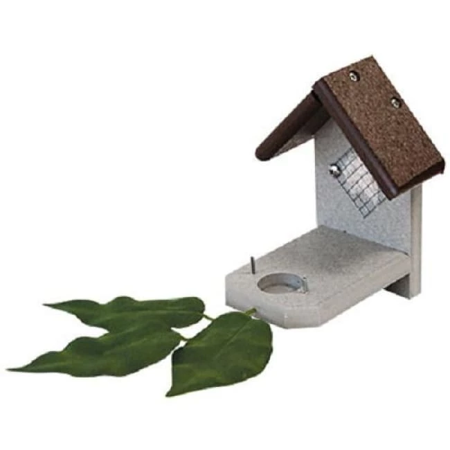 Help hummingbirds find a safe and secure roosting spot by placing this Polywood Brown and Gray Recycled Plastic Hummingbird Nest in your yard. These amazing birds tend to place their nests directly on tree branches, and sometimes on chain or wire loops, and this hardy piece provides them a convenient and stable platform to do so. A front, extended platform sports a 1″ diameter impression and two metal posts, creating a place for their cup-shaped nest. Fabric leaves extend from the front of the platform for perching, and the upright back panel makes it simple to attach the item to a post, wall, or tree. A pitched roof protects the nesting material behind a metal mesh screen on this upright, and the brown and gray hues mesh with the outdoors. Crafted by the Amish from durable, recycled plastic lumber and stainless steel hardware, this piece is sure to remain lovely for use over and over again. This material also helps decrease landfill waste, for an environmentally friendly garden addition. Watch hummingbird nesting behavior like never before with this Polywood Brown and Gray Recycled Plastic Hummingbird Nest. Made in the USA.