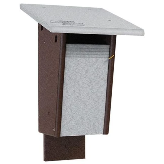 Add a unique bluebird roosting spot to your yard with this Polywood Gray and Brown Recycled Plastic Sparrow Resistant Bluebird House. Providing musical bluebirds a shelter specifically designed for their needs can help increase their populations, and this unit can also discourage house sparrows from roosting. Made by the Amish from recycled plastic milk jugs, this environmentally friendly roost box sports a generous, overhanging roof and innovative, slot shaped entry. Routed lines beneath the entry help bluebirds grip it without a perch, and the shape often deters sparrows. The roof protects the interior from rain and snow, and ventilation holes beneath it keep the nestlings from overheating. Gaps on the base allow any captured water to drain for added avian safety. The front panel opens downward for nest checks, and the lengthy back panel with predrilled holes makes placement against a post or wall simple. The dark brown body and gray roof lend a natural hint to the unit, while the recycled plastic construction provides durability with little maintenance. Stainless steel hardware offers even more strength and longevity, and the thoughtful design brings bluebirds’ needs to the forefront. Encourage lovely bluebirds to roost in your yard by placing this Polywood Gray and Brown Recycled Plastic Sparrow Resistant Bluebird House in it. Made in the USA.