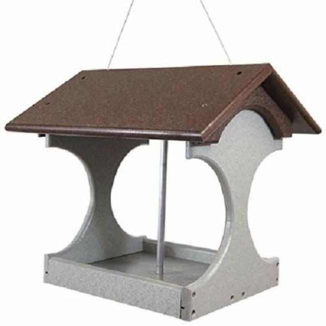 Enhance your bird feeding repertoire by placing this Brown and Gray Polywood Recycled Plastic Suet Log Bird Feeder in your yard. The natural tones and unique design of this item adds an unexpected look to your landscaping, while offering birds a fun dining option. An upright, metal shaft forms the center of this piece, perfect for holding an 8″ tall or shorter suet or seed log. A metal, mesh tray captures any suet pieces or seed hulls, and offers plenty of drainage. Its generous, pitched roof covers this tray, and gray uprights create a striking, fly-through design. Swing this roof upward to refill or clean the unit, and hang it using the attached cable and metal loop. For a different effect, attach a 1.75″ diameter or smaller adapter to the bottom support beam and pole mount the feeder. Its durable, recycled plastic lumber body forms a lasting unit while diminishing landfill waste, and the gray and brown tones mesh with the outdoors easily. Create a unique dining spot for your feathered friends with this Brown and Gray Polywood Recycled Plastic Suet Log Bird Feeder. Made in the USA.
