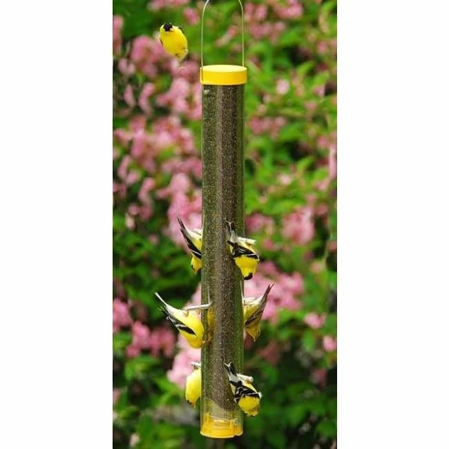 Watch beautiful, acrobatic birds dine in your garden with the Droll Yankees 16″ Upside Down Finch Flocker Feeder. Placing a songbird selective, thistle-only feeder in your bird sanctuary enhances its appeal, inviting goldfinches and chickadees to the area. The sturdy, polycarbonate seed tube holds 0.8 quarts of nyjer seed or blend, and the 6 ports each have an individual perch. These ports rest beneath the perches, allowing siskins, goldfinches, and redpolls to feed, but preventing other birds from using the item. House finches and house sparrows do not enjoy feeding upside down, and thus will refrain from using the feeder. A sloped base on the piece prevents seed from gathering, and drainage holes allow it to stay dry. The heavy-duty metal cap rests tightly atop the reservoir, making it difficult for predators to lift and reach the seed. The metal cap, perches, and base create a lasting feeder, and the bright yellow color of the cap and base help attract certain birds. Use the attached stainless steel wire to hang the item, or pole mount it with help from a 0.75″ threaded adapter (not included). Enjoy feeding goldfinches in your garden in an exciting way with this Upside Down Finch Flocker Feeder. Made in the USA. Lifetime warranty.Â