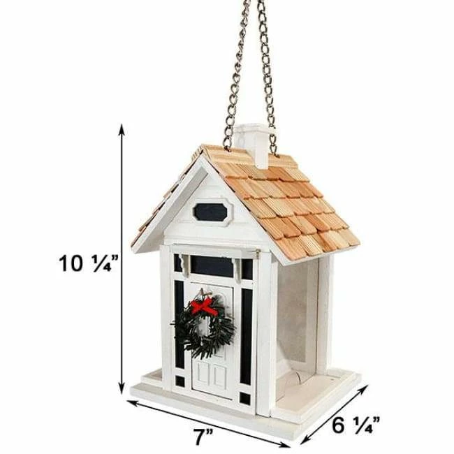 Offer your feathered friends a seasonal dining spot by placing this Home Bazaar White Holiday Bellport Cottage Bird Feeder in your yard. Ornately crafted and designed to mimic the architecture of homes in the Long Island village of Bellport during Christmas, this wooden and plastic feeder will certainly capture attention when added to your sanctuary. White, beadboard-inspired siding, a pitched and shingled roof, faux doors and windows, and a fabric wreath with red bow combine for a spectacular garden accent. Clear, plastic panels form the other two sides of the unit, creating a traditional, rectangular seed reservoir. This column holds 1.35 quarts of bird seed, and a significant diverter at the base of this chamber directs feed to the two arched openings, for birds to reach it. A rectangular platform sports drainage holes in each corner for dry seed, and a raised lip around it to keep seed in place and offer perching spots to your backyard birds. The roof lifts upward easily for refilling or thorough cleaning, and a chain hanger through it makes placement on a branch or bracket simple. Its wood and plastic construction forms a classic piece, while the white paint lends a bright look to your yard. The wreath offers a yuletide effect, and can be removed for use year round. Spread Christmas cheer into your yard with this White Holiday Bellport Cottage Bird Feeder.