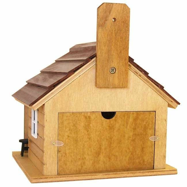 Add a touch of rugged, masculine style to your bird garden with this Home Bazaar Man Cave Bird House. This ornate, wooden roost perfectly mimics a cabin, complete with miniature elements commonly associated with a man cave. A classic, rectangular shape and pitched roof form a recognizable shelter, while the brown tones of each celebrate wood. A miniature bench and stools rest on the porch, along with a planter, lantern, and even a faux rug. The black and green tones of the furniture contrast the brown shelter, and white trim on the door and window shapes further the effect. A 1.25″ diameter entry hole rests beneath the roof ridge, perfect for small songbirds to enter and use the piece. The unpainted interior offers your feathered friends plenty of roosting area, and a drainage hole on the base allows any captured water to exit. The overhang of the roof covers the ventilation gaps on each side, which help prevent nestlings from overheating. Remove the back panel from the home for nest checks and periodic maintenance, and showcase it on a tree or wall using its mounting tab. For a charming, interior decoration, place the unit on a level surface. Its brown color scheme enhances your landscaping, and the wooden construction is fantastic for birds. Create a rustic and rugged look in your bird garden by adding this Man Cave Bird House to it.Â