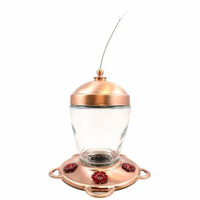 Lift your hummingbirds’ spirits by placing the More Birds Jubilee Hummingbird Feeder in your garden. The rounded shape and copper colored accents on this feeder lend a wonderful shine to your backyard, while keeping plenty of nectar available for your feathered friends. The glass bottle flares outward toward the top, holding a generous 32 ounces of nectar, and a flattened, saucer style base completes the unit. Five red, metal flower shapes adorn this base, for a few birds to dine at once, and a perch extends by each for resting spots. The copper color on this saucer, along with the matching cap, easily captures attention, and the top, rounded finial adds a fun hint. A metal cable extends from this finial, allowing you to hang the feeder from a hook, and the reservoir unscrews from the saucer to clean or refill it. Nectar levels remain visible at a glance thanks to the clear glass bottle, and the red and copper colors perfectly enhance your foliage. Invite hummingbirds to congregate in your garden with this Jubilee Hummingbird Feeder.