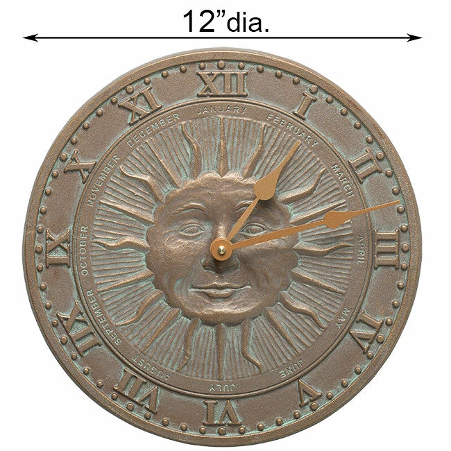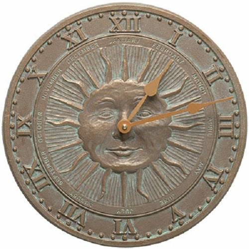 Brighten your wall and cheerily tell time using the Whitehall Sunface Clock. This artistic timepiece brings personality and style to your deck or home with ease. A raised sun shape sits in the center of this clock, with a smiling face and emanating rays. The rays and face in relief bring texture to this unit, further enhanced by the verdigris color throughout the recessed sections of the art. A band of Roman numerals forms the dial on this clock, with raised dots between the numerals for minute indicators. Copper colored hands from the center of the face help you tell the time in an instant. A small band between the center artwork and Roman numerals lists the months of the year, furthering the timekeeping element on this item. Its copper colored background looks fantastic either outside or in the home, and the aluminum construction easily withstands harsh weather. The clock runs on 1 included AA battery, and mounts to a wall in moments with the included hardware. Enliven your timekeeping using this Sunface Clock. Made in the USA.